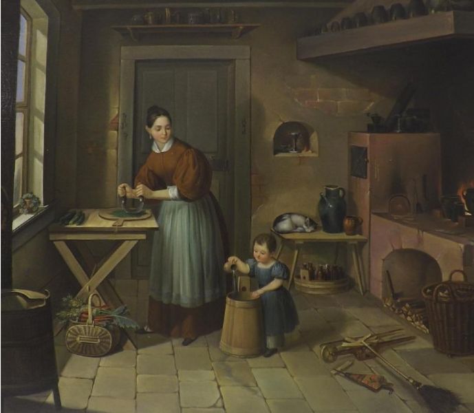 interior kitchen scene with mother and daughter