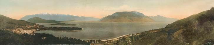 Panoramic of Queenstown showing Remarkables, Arthurs Peak, Lake Wakatipu