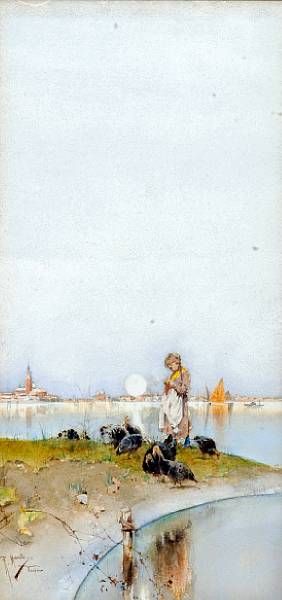 A Venetian girl feeding birds at the shore