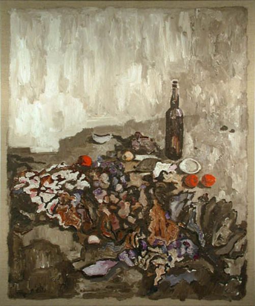 Stilleben mit Blättern, Früchten und Flasche vor weißem Hintergrund