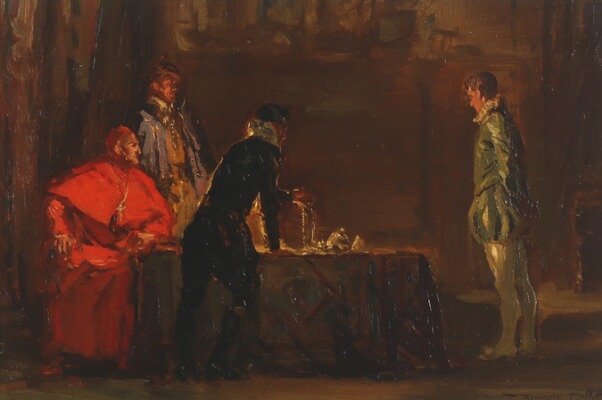 Scene from the Renaissance with a cardinal in conversation with gentlemen