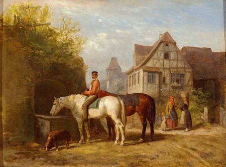 | Reiter mit Pferden an der Tränke; plaudernde Bäuerinnen vor malerischer Architekturkulisse | |