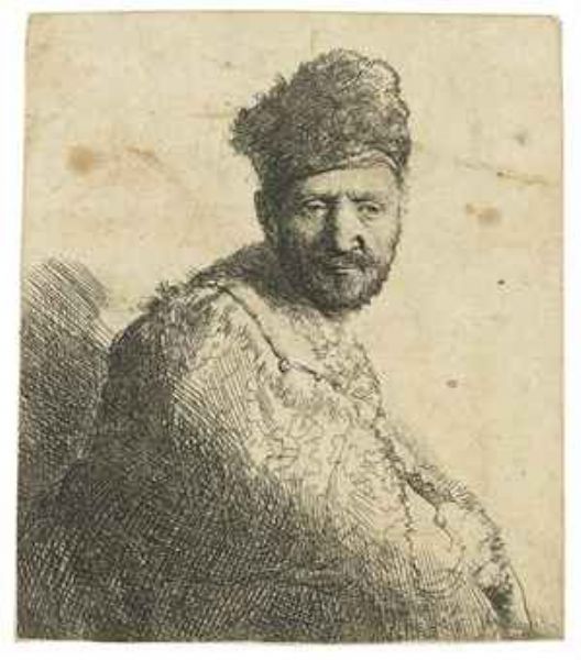 | A Bearded Man, in a Furred Oriental Cap and Robe: The Artist's Father (Bartsch, Hollstein 263; Hind 53) | |