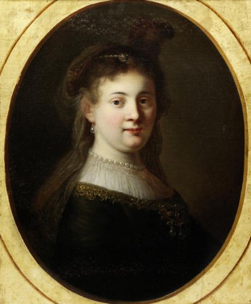 | Portrait of Saskia van Uylenburgh, bust-length, in a black dress and a feathered hat, within a painted oval | |