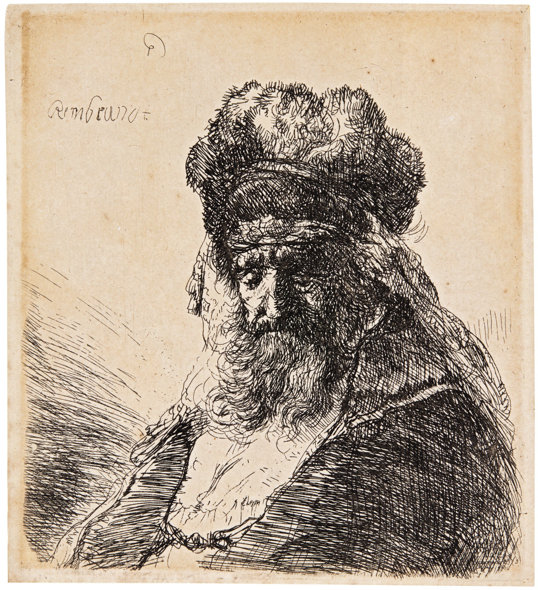 | BEARDED OLD MAN IN A HIGH FUR CAP, WITH EYES CLOSED (B., HOLL. 290; NEW HOLL. 148; H. 130) | |