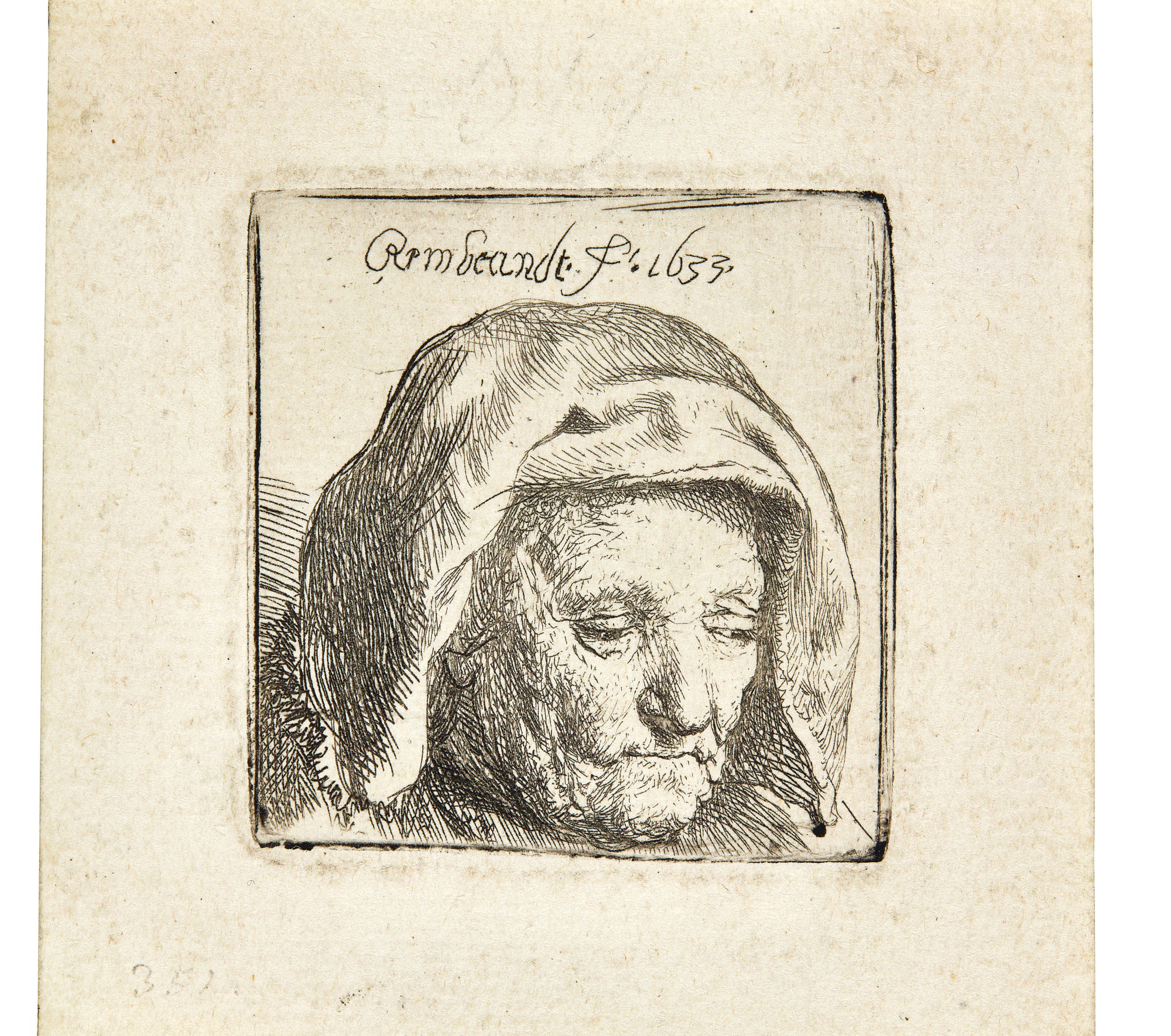| THE ARTIST'S MOTHER IN A CLOTH HEADDRESS, LOOKING DOWN: HEAD ONLY (B., HOLL. 351; NEW HOLL. 121; H. 107) | |