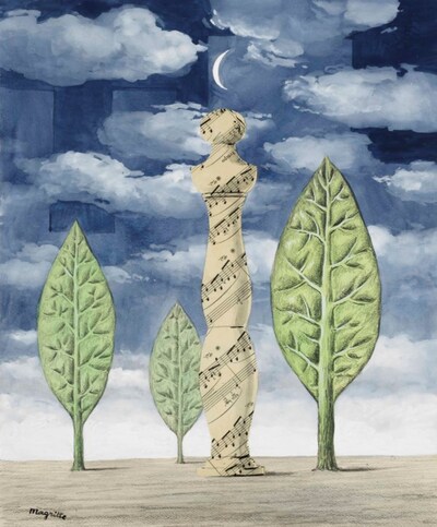 | Gouache watercolor, sheet music collage, charcoal and pencil on paper | |