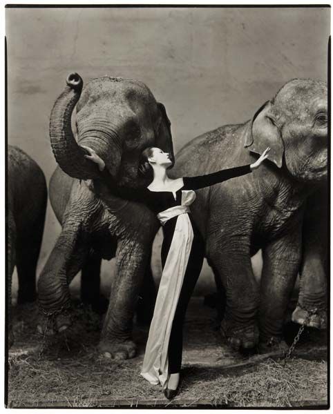 | Dovima with elephants, evening dress by Dior, Cirque d'Hiver, Paris | |