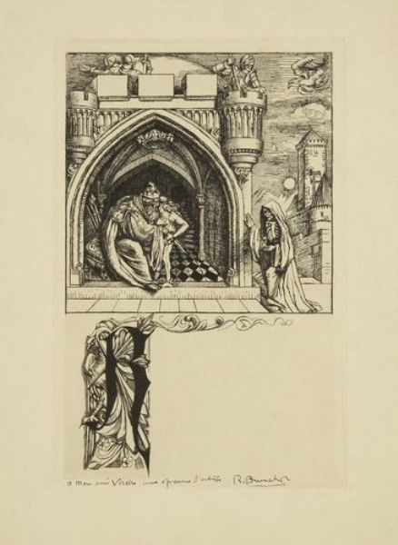 | [Seigneur médiéval lutinant un page, la Mort les guettant]. Illustration de livre. | |