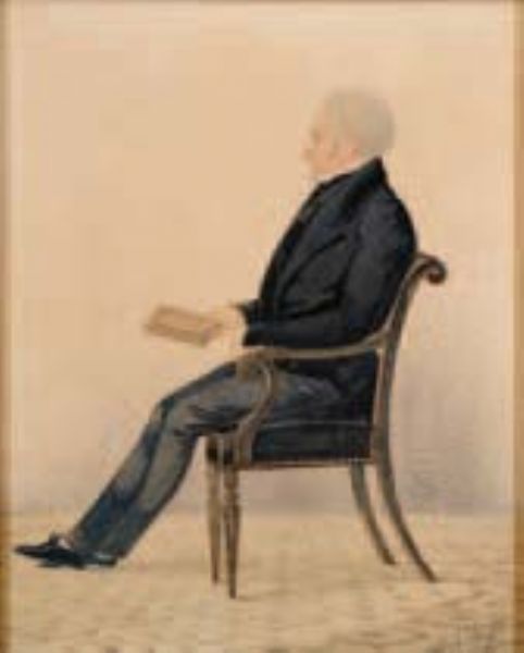 | Portrait of a gentleman seated, full-length, wearing a black jacket and collar holding a book in his right hand | |