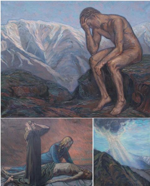 | Beweinung. 1925; Männlicher Akt in Landschaft. 1926/27; Italienische Alpen / Sonnenstrahlen. Cumiana 1926. | |
