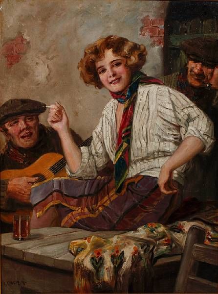 | Spanish study of a young woman sitting on a table smoking a cigarette a guitarist and a man smoking a pipe behind her | |
