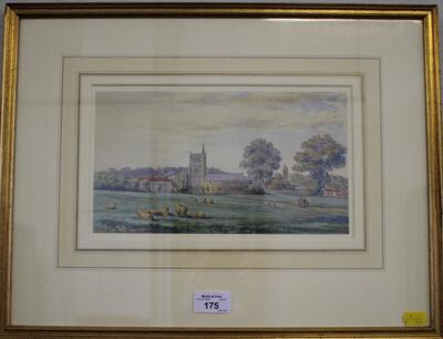 Rural landscape with church and sheep
