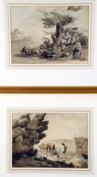 | showing figures in country landscapes, one with sheep, playing a flute, the other ploughing the land with horse drawn plough | |