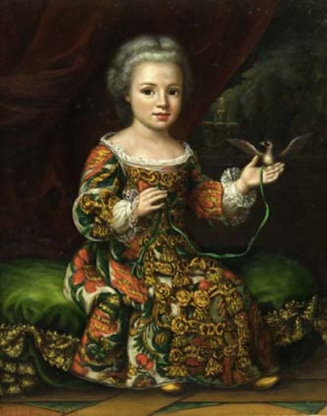 Auf grünem Kissen sitzendes Mädchen mit grauer Lockenperücke