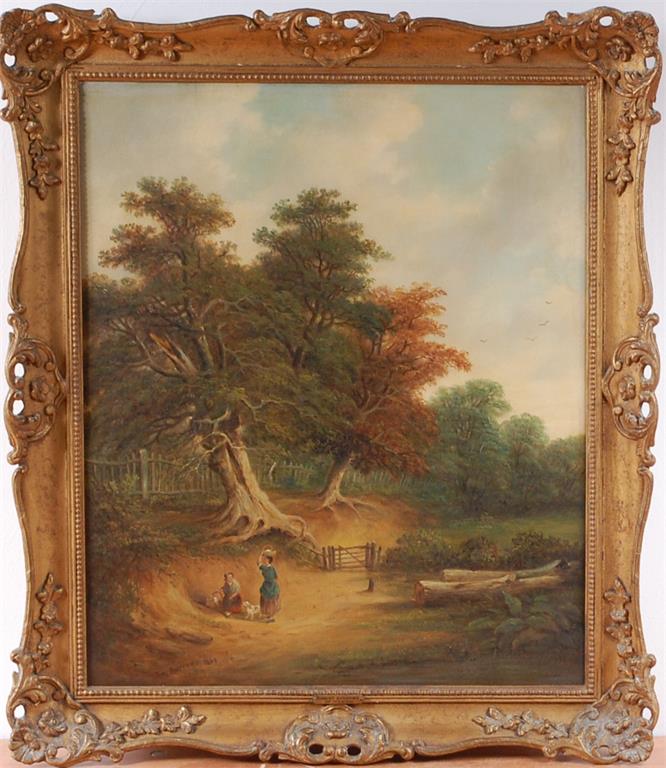Travellers with dog on a woodland path