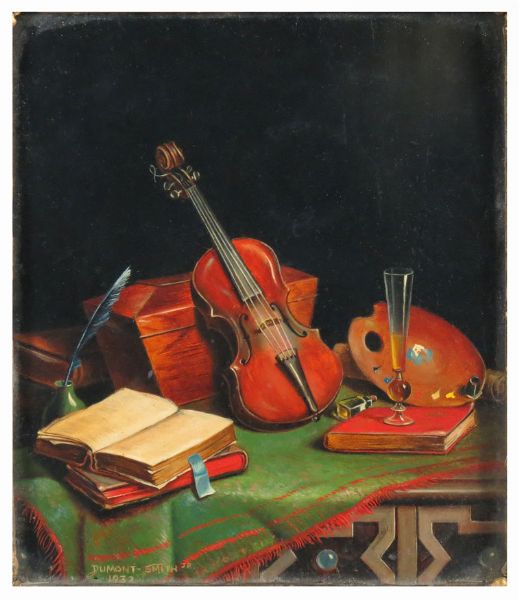 miniature still-life with violin, tea caddy, etc.