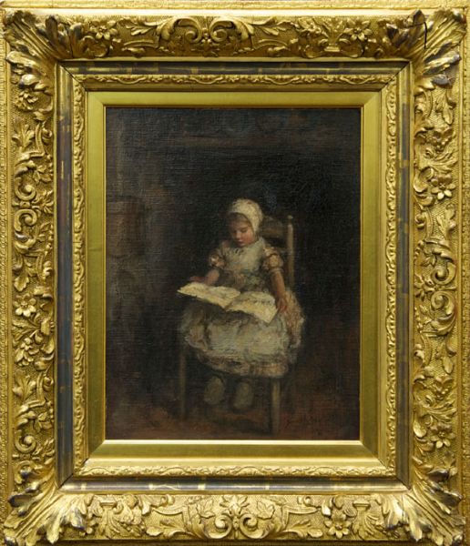 portrait of a young girl seated upon a chair reading a book