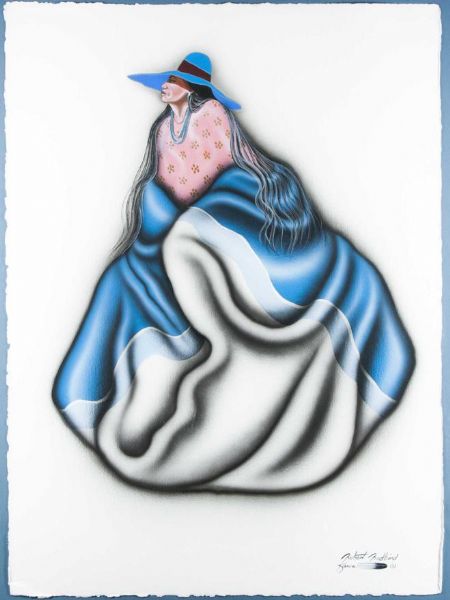 a Native American woman, wearing a hat with her long hair spread down her shoulders