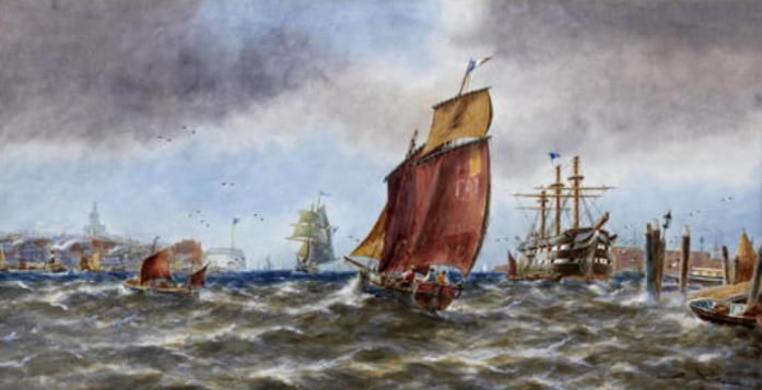Shipping in a harbour mouth, possibly Portsmouth
