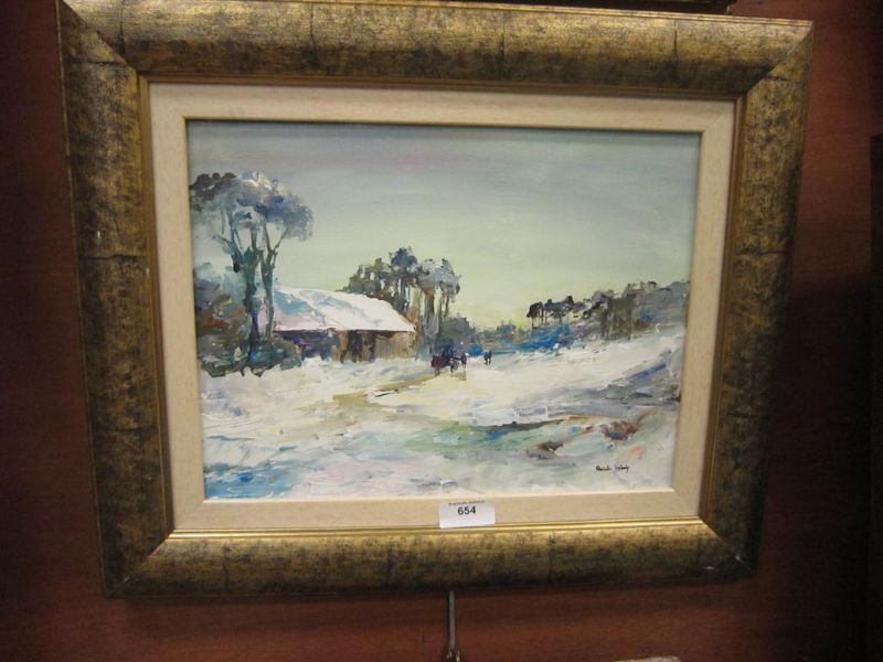 A winter scene with Figures and Cart by a Barn
