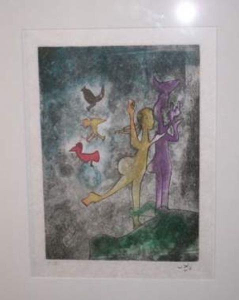 Aquatint and etching on coloured