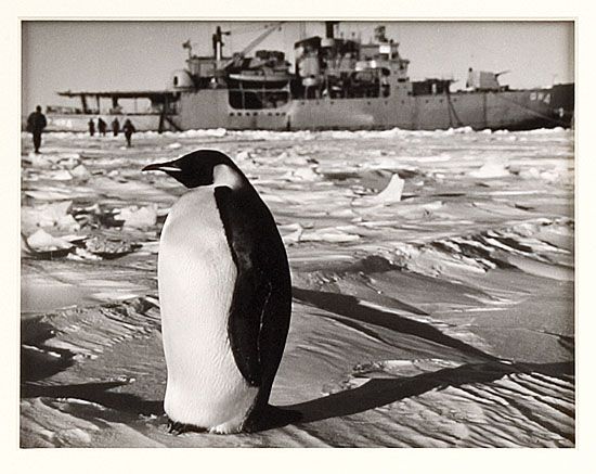 | Bay of Whales, near US base Little America. An Emperor Penguin with the US icebreaker 'Glacier' (GB4) in the background. | |