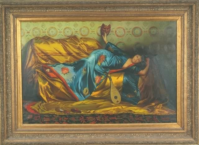 Interior portrait, reclining woman in Asian dress with instrument and mask