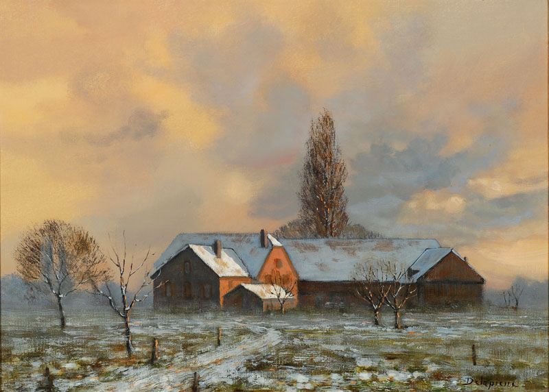 Verschneite Landschaft mit Bauernhaus im Abendrot