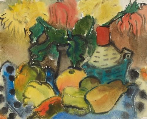 BUNTER STRAUSS MIT FRÜCHTEN UND KORBFLASCHE III