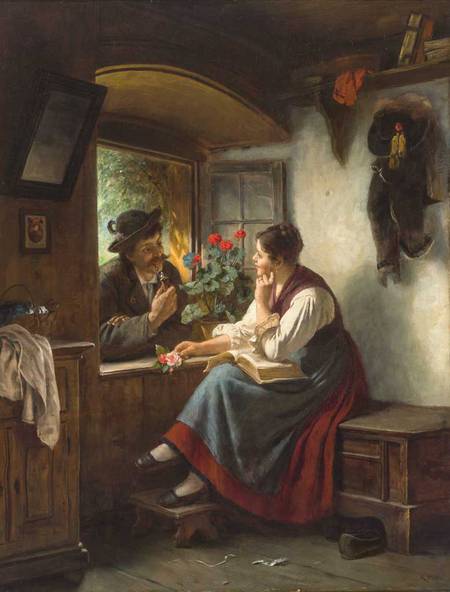 Schwarzwälder Stube mit tändelndem Paar am Fenster