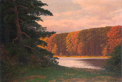Sunlit pines on the banks of a Märkische lake