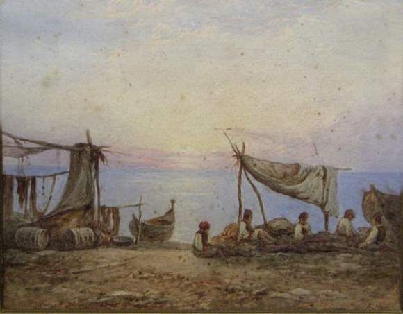 Am Ufer sitzende neapolitanische Fischer in der Abenddämmerung.