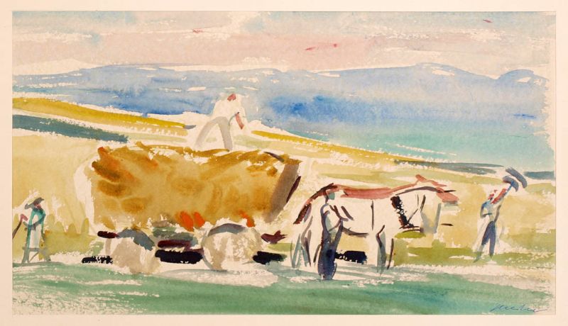 Bauernfamilie bei der Heuernte mit beladenem Pferdefuhrwerk.