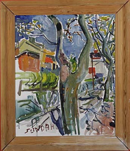 komposition med träd och hus