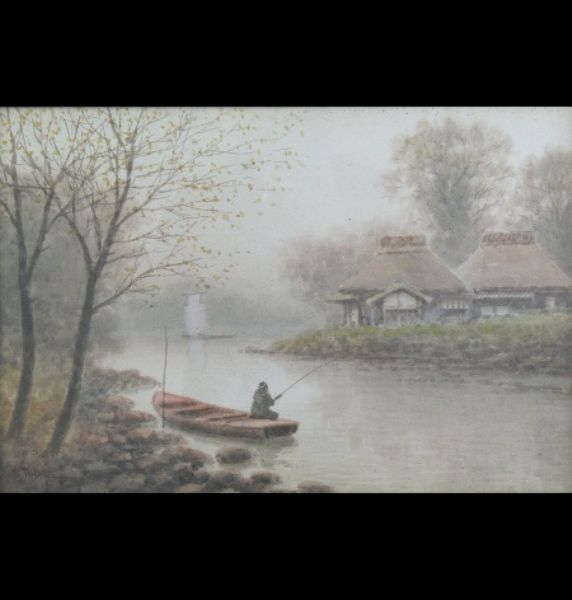 tranquil river scene with fishermen in a boat, dwellings in the distance
