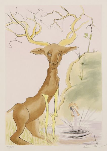 | Der Hirsch, der sich im Wasser spiegelt (Aus der Folge: Le Bestiaire de la Fontaine Dalinisé). | |
