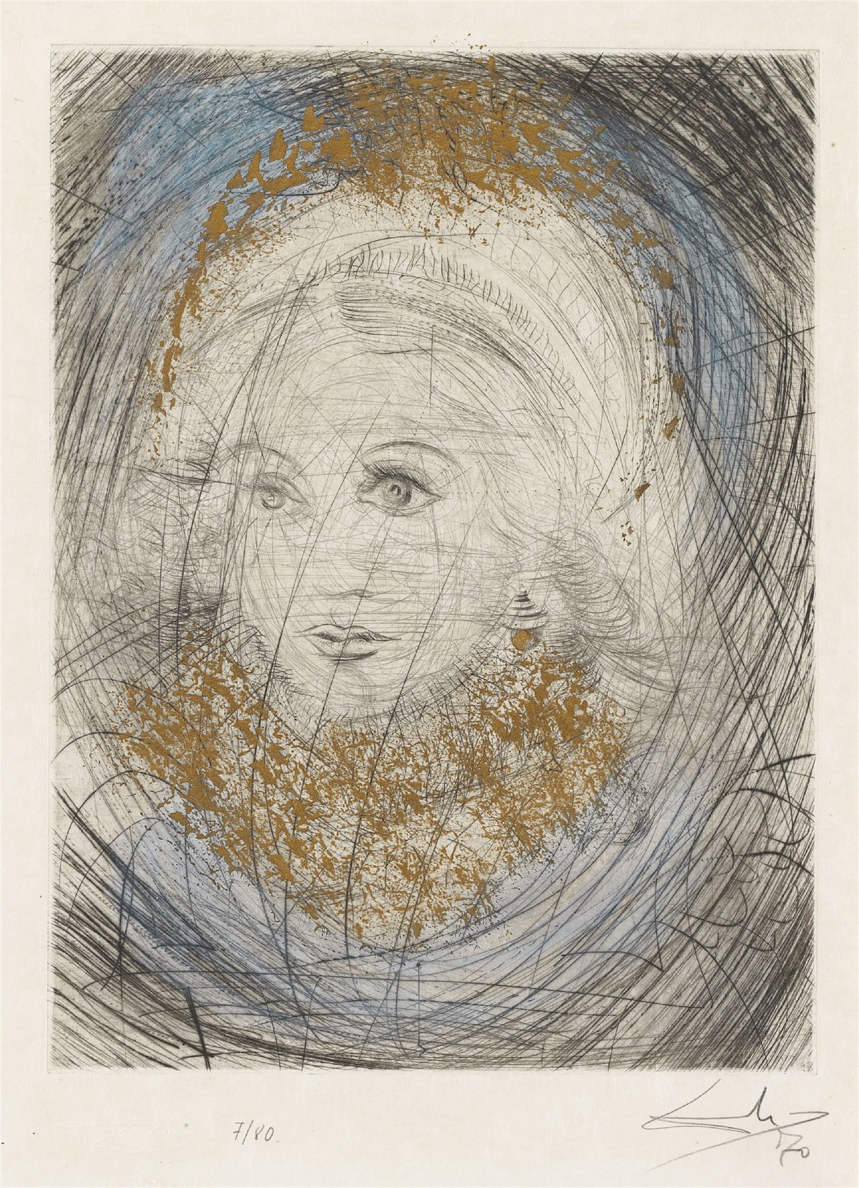 | Etching watercoloured in blue with gold leaf on Japon nacré with embossed stamp "Dali" | |