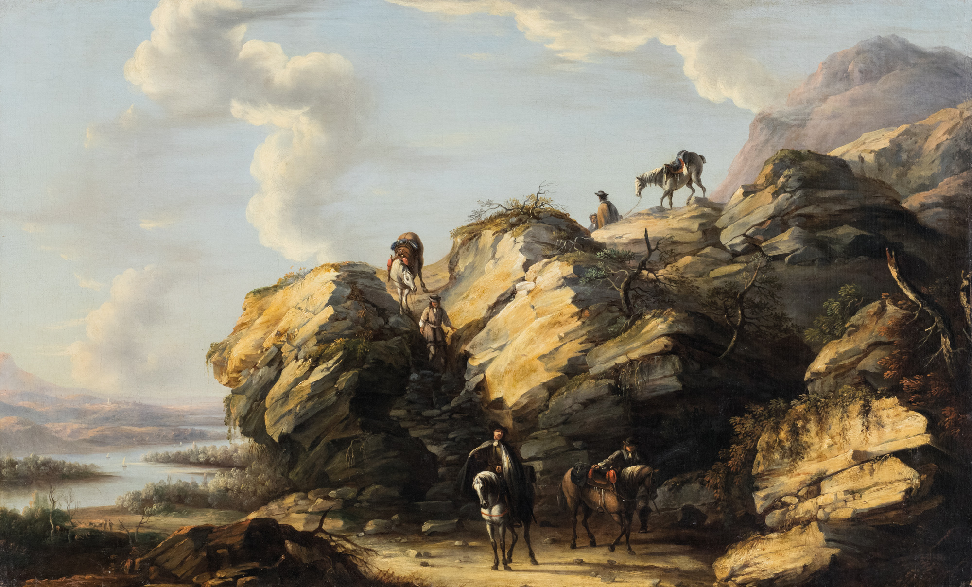 | Riposo di cavalieri in un paesaggio roccioso con fiume in lontananza | |