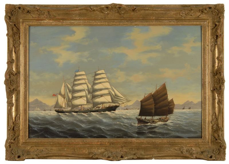 Harbor scene of an Oriental junk passing a three-masted clipper ship flying a British flag off its stern