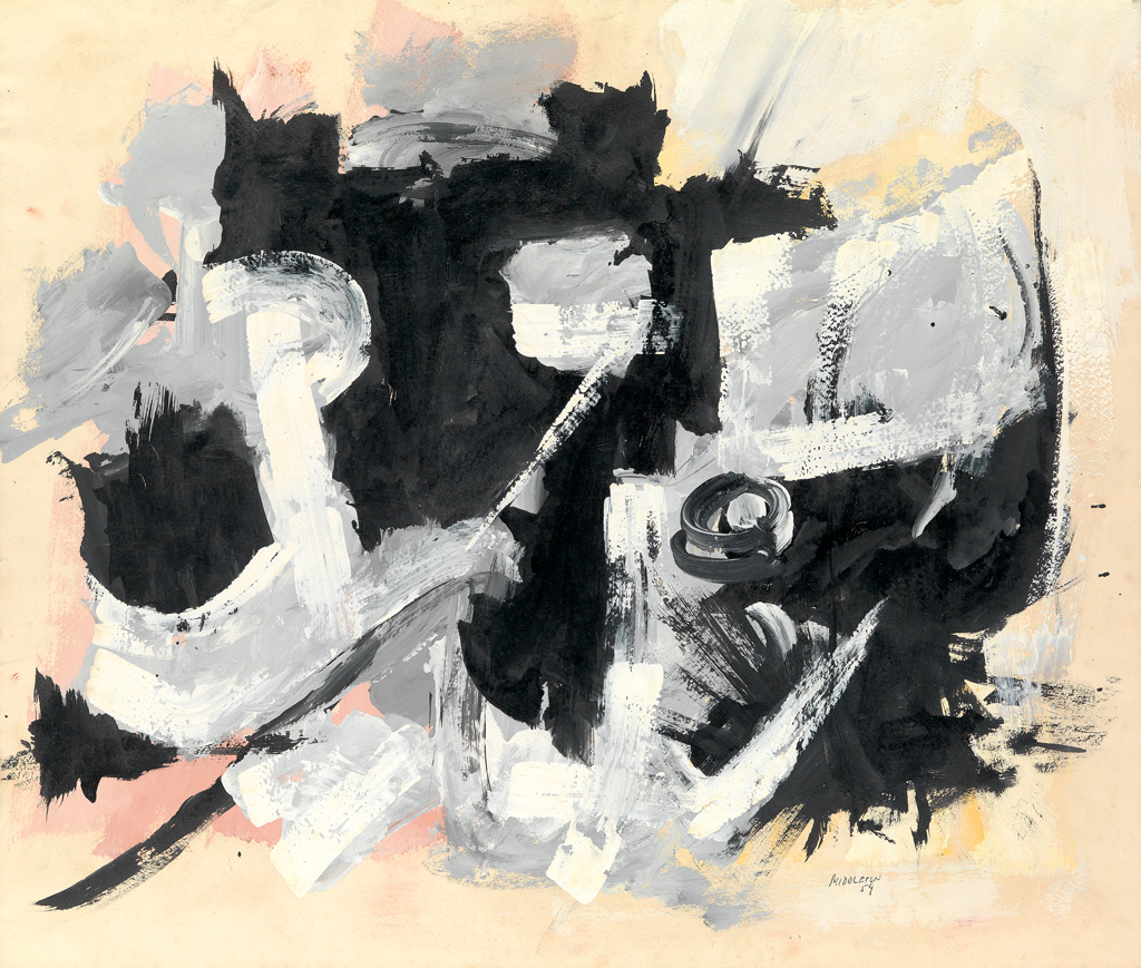 | Tempera brush and ink and gouache on textured cream wove paper, | |