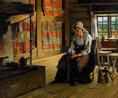 Allmogeinteriör med kvinna vid smörkärna