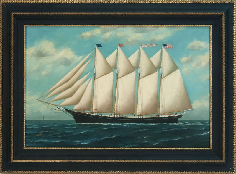 | The four-masted black-hulled schooner Estelle Phinney with a coastal lighthouse off her bow | |
