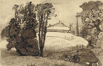| A cornfield with windmill and spire seen under a crescent moon | |