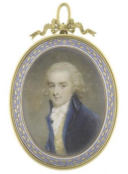 | A Gentleman, wearing blue coat, yellow waistcoat, white frilled chemise, stock and cravat, his powdered hair worn en queue. | |