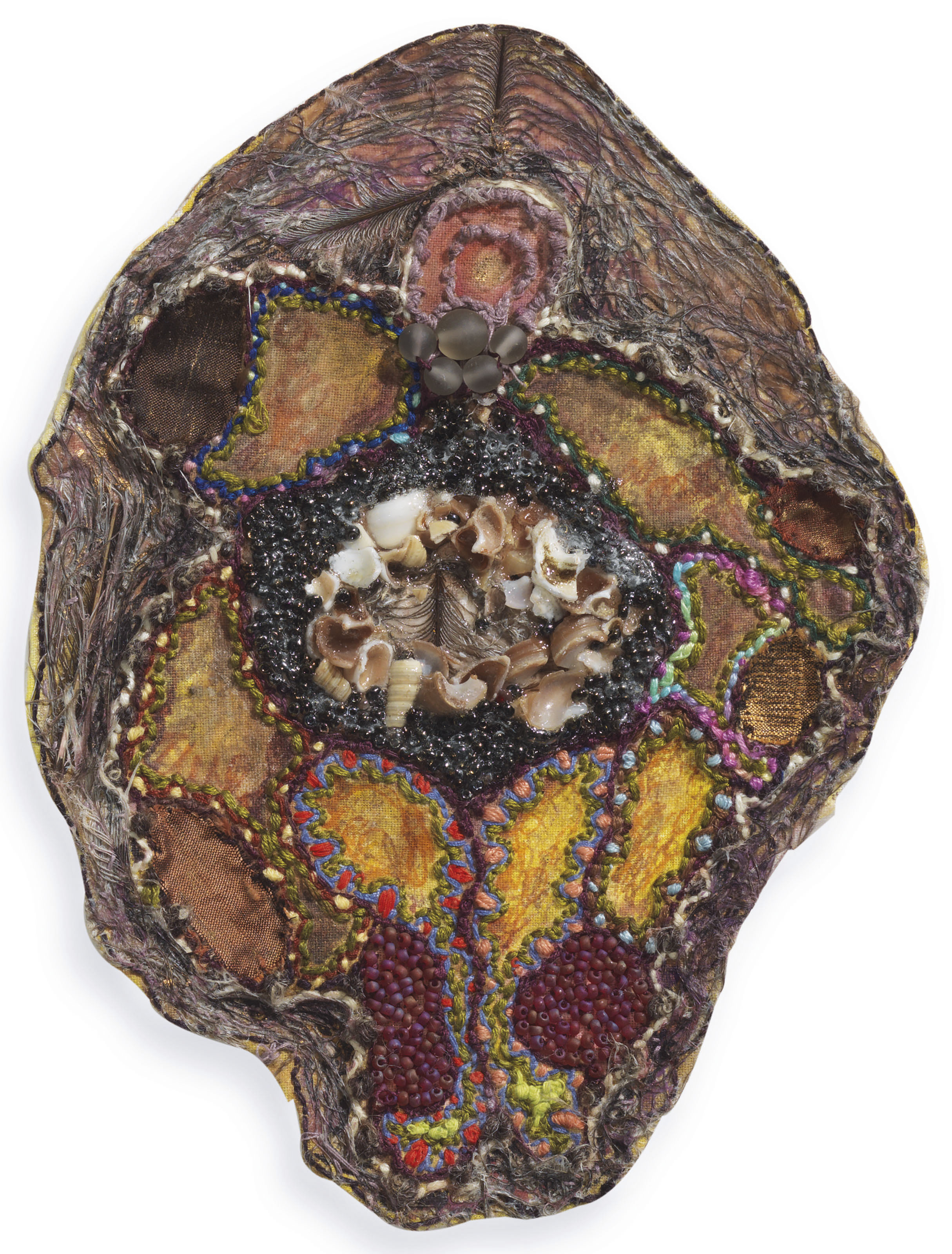 | Mixed Media including beads, shells, fabric and feathers on canvas mounted on paper | |