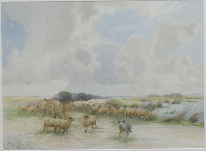 study of Romney Marsh sheep grazing with shepherds in foreground