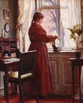 Interior with a woman watering flowers