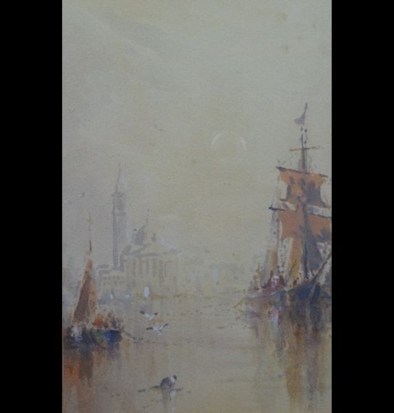 Venetian canal scene with moored sailing vessel and buildings in the background