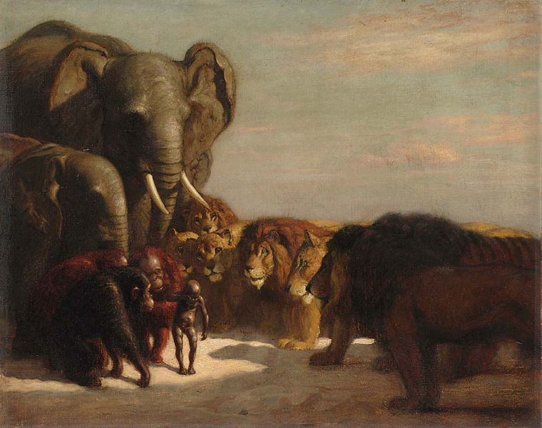 | Wilde Tiere im Kreis um einen kleinen Negerjungen stehend | |